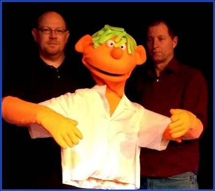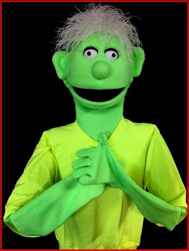 Dominique is made with neon yellow fleece and has a beautiful curly, green fluorescent wig. Dexter is made with neon orange fleece and has green fleece hair. Our newest Life-size puppet, Douglas, is made of neon green fleece & has white ostrich feathers for his hair. All 3 puppets’ eyes glow in the dark. As always, their mouthplates are made of wood and have the familiar THP mouth grip that our customers love!